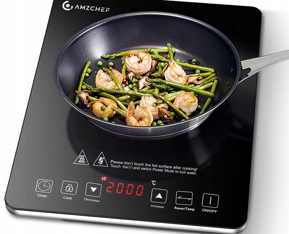Nowoczesna płyta indukcyjna AMZCHEF 2000W z 10 poziomami mocy i temperatury.