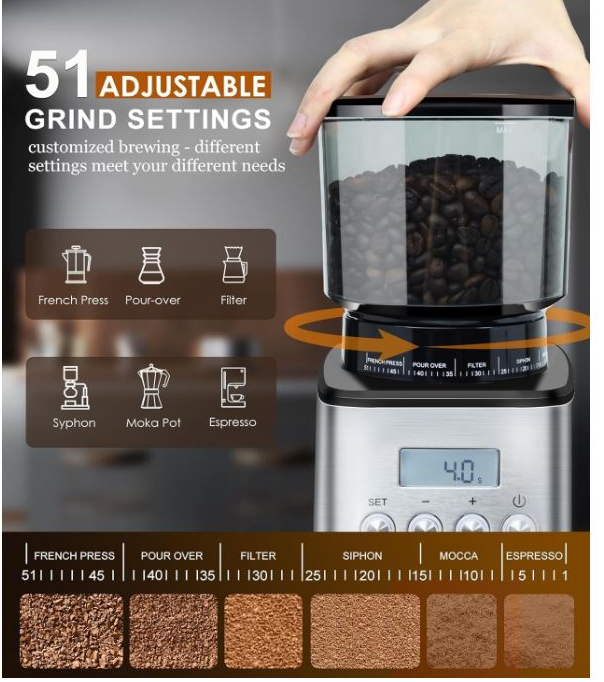 Elektryczny młynek Homtone w kolorze srebrno-szarym to szybkie i wygodne mielenie kawy z zachowaniem pełni aromatu.