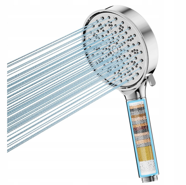 - 20-warstwowy system filtracji – usuwa chlor, metale ciężkie i inne zanieczyszczenia dzięki zastosowaniu KDF, siarczynu wapnia, węgla aktywnego, witaminy C i minerałów.
