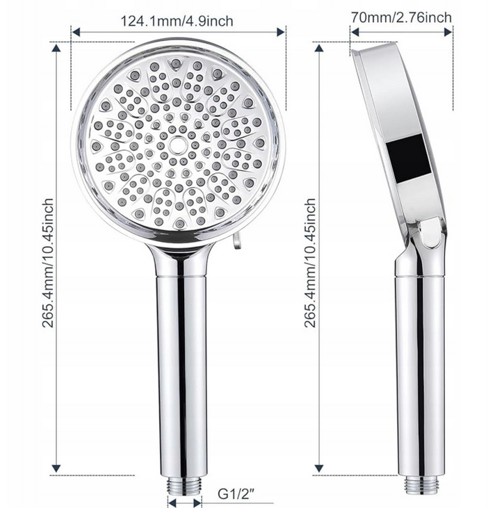 - Duży panel 124 × 124 mm – zapewnia szeroki strumień wody i pełne pokrycie ciała podczas kąpieli.