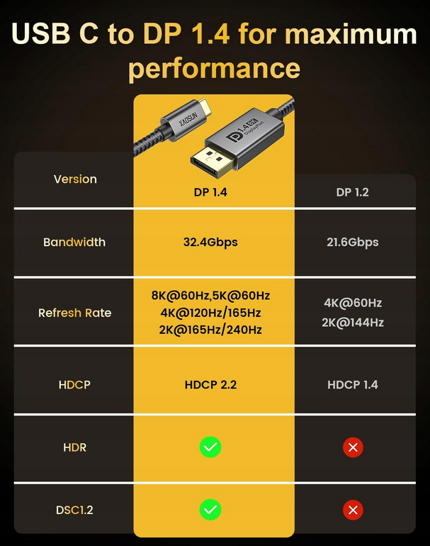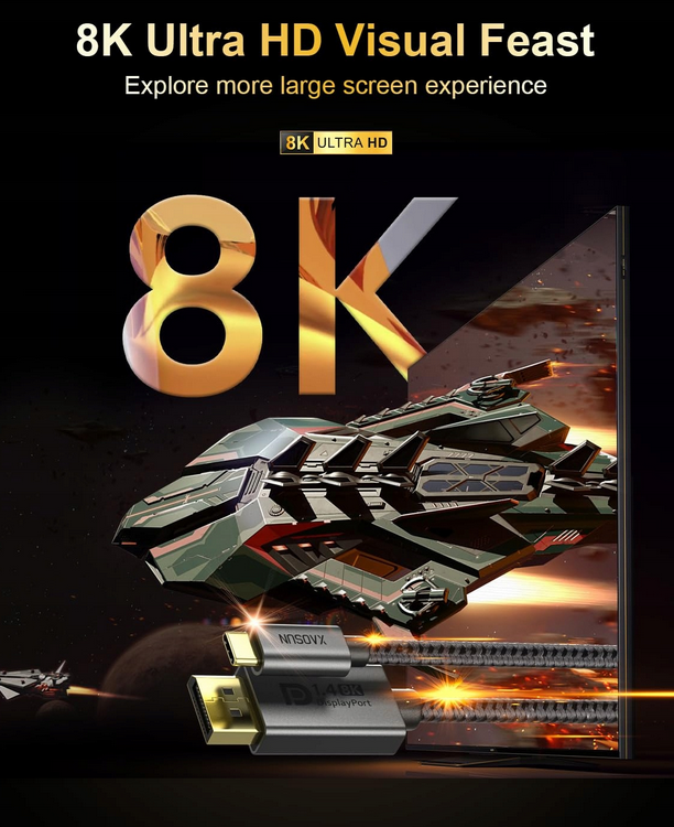 XAOSUN KAbel USB C DisplayPort 1.4 [8K @60Hz 4K @165Hz 2K @240Hz]