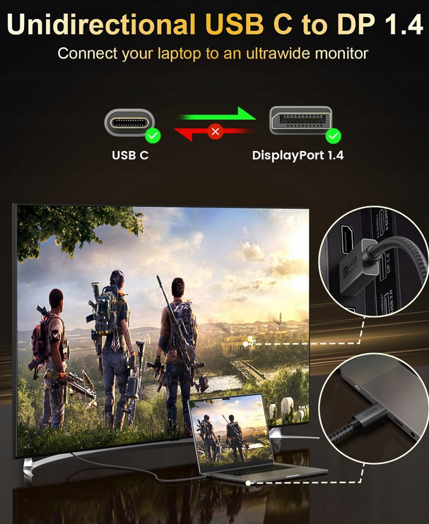 - Uwaga: Jeśli potrzebujesz rozdzielczości 8K, upewnij się, że Twój komputer i monitor obsługują 8K. Kabel USB C do DP: kabel Thunderbolt 3/4 do DisplayPort obsługuje dynamiczny HDR, optymalizując ciemny obraz i poprawiając szczegółowość, dzięki czemu uzyskasz żywe i realistyczne kolory